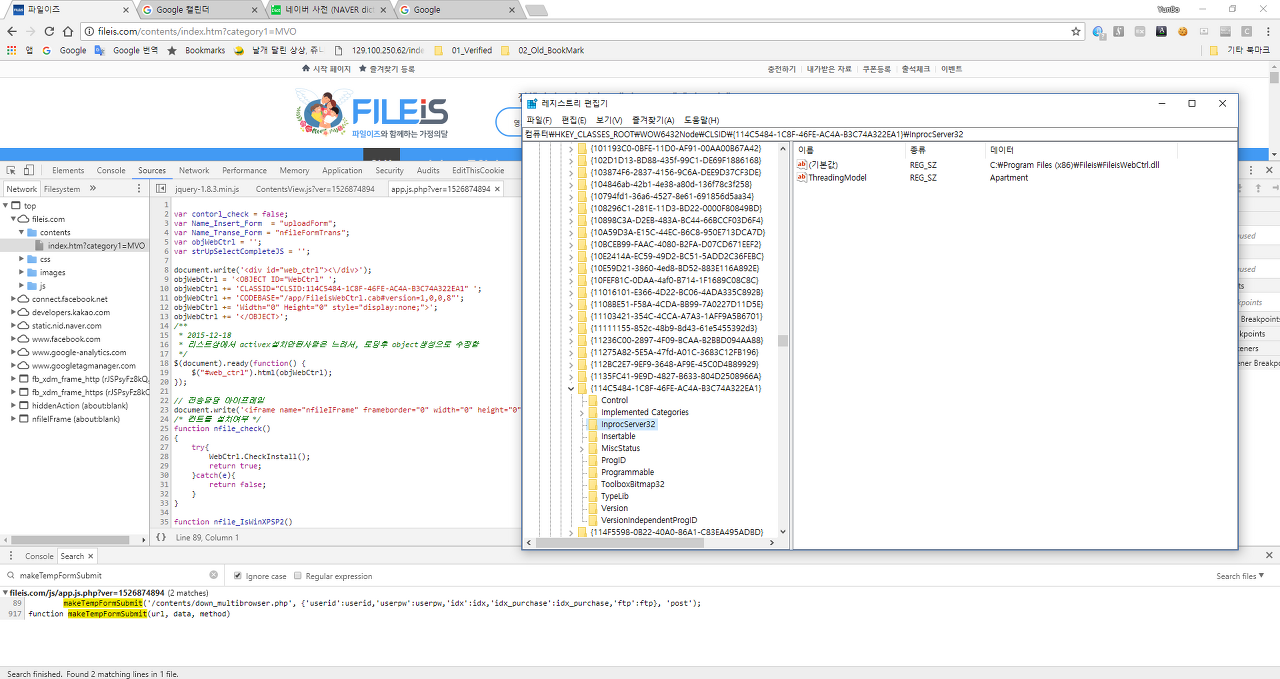FileIsWebCtrl.dll은 익스플로러로 해당 웹사이트 서핑시 아래와 같은 자바 스크립트에 의해 구동되며 해당 라이브러리의 동작은 FileIsLocal과 동일하다. 해당 dll은 일반적인 ActiveX와 동일하게 레지스트리상에서 클래스 ID로 검색이 가능하며 아래와 같은 경로에 존재하는 것을 알 수 있다.