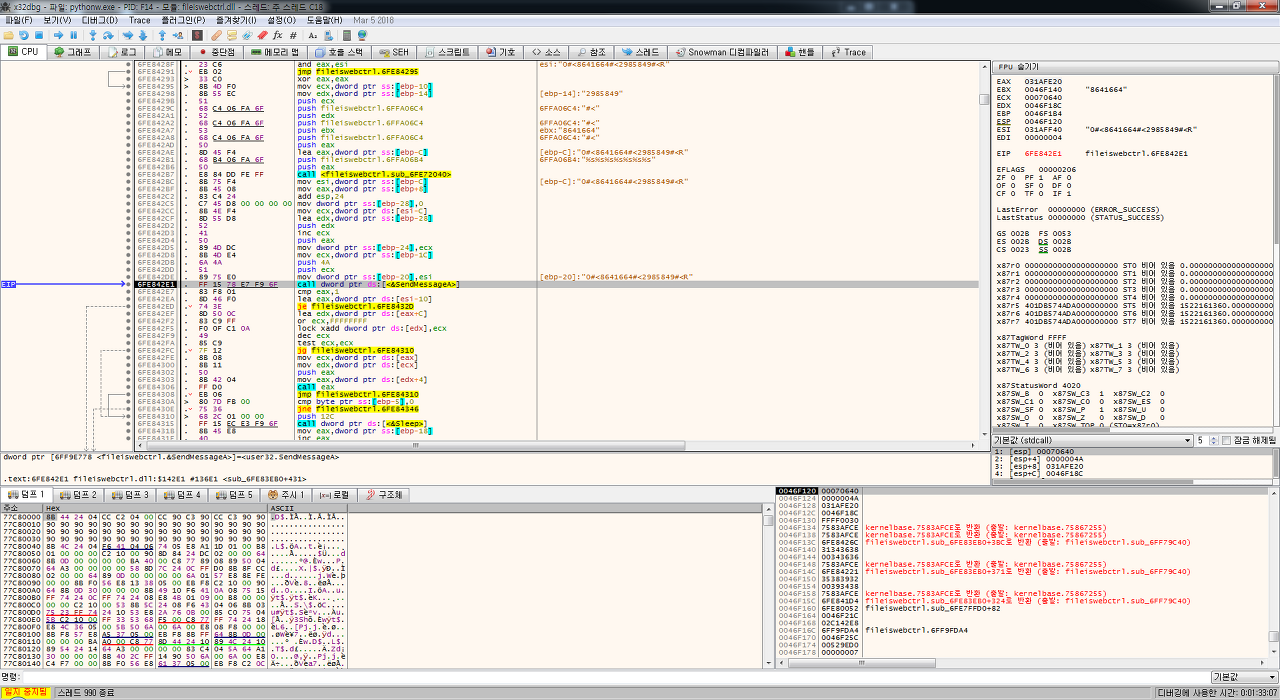 먼저 그림7~10에 걸쳐 브라우저별로 실제 다운로드를 실행할 모듈 2개중 어느 모듈을 분석할지 결정을 해야 하는데 결론적으로 보면 어느 모듈을 보든 마찬가지지만 좀더 간편하게 진입점을 찾을 수 있는(사실 너무 간단한 분석이라 동일하지만) ActiveX로 결정을 하고 진행을 하였다. 위의 그림 10에서 찾은 ProgID를 바탕으로 python의 win32com 모듈을 사용하여 간단하게 해당 ActiveX모듈을 메모리에 올린 후 그림7과 동일한 WebCtrl 컨르롤로 선언하여 동일한 파라메터사용 DownLoad() 모듈을 호출하면서 해당 python 프로세스에 x64Dbg를 attach한 후 dll 엔트리포인트 진입시부터 디버깅을 하면 되겠다 추정하며 작업을 시작하였다.
