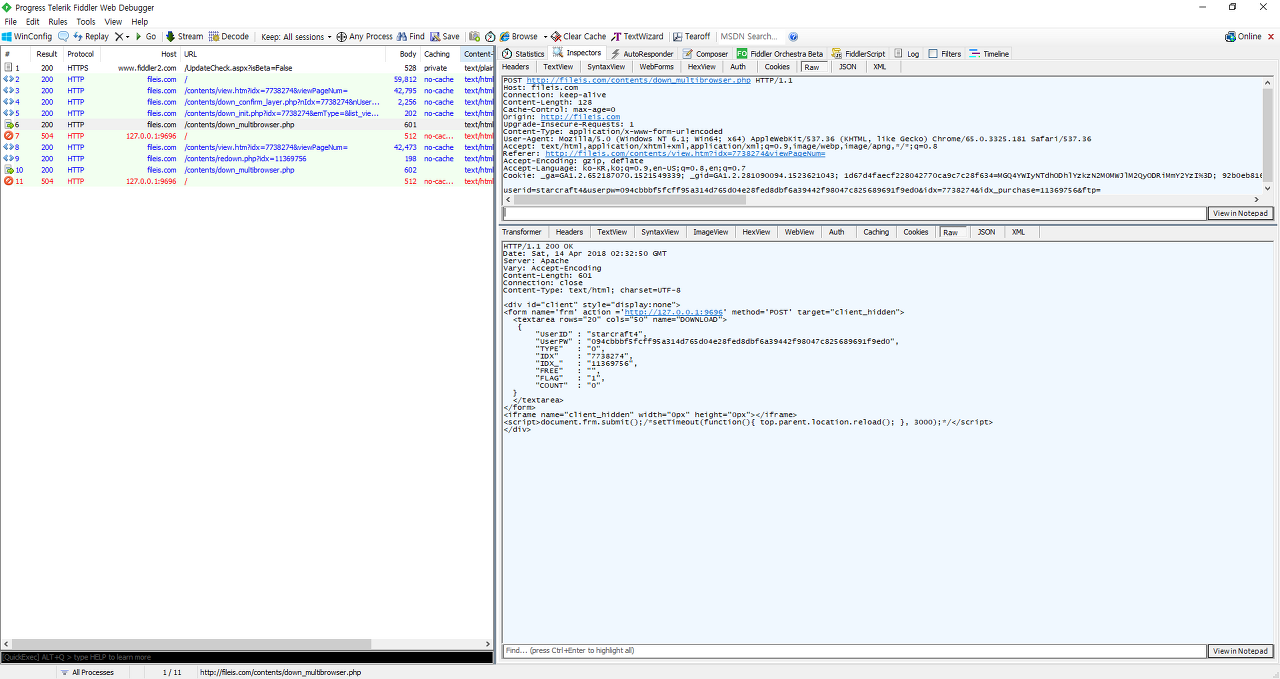 그림11과 같이 webctrl에서는 Fileis_class_down 이라는 클래스명으로 FindWindowA() Win32Api를 호출 프로세스 리스트상에 FileisDown.exe가 실행중인지를 체크 후 실행중이 아니면 다운로드모듈을 실행하고 실행된 윈도우의 핸들을 반환받고, 이미 실행중이면, 해당 윈도우 핸들에 다운로드 파일에 대한 파일아이디와 구매아이디를 0#<파일아이디#<구매번호#<R 과 같은 문자열로 구성하여 SendMessageA로 전송하고 FileisDown.exe 프로세스에서는 런처에서 보내져온 SendMessage를 디스패치하여 파싱 후 FileisCMC.dll의 다운로드파일정보 추출 및 구매이력 확인등의 로직을 거쳐 NAT.dll 모듈로 실제 다운로드 서버에 접속 후 다운로드를 시도하게 된다. 아래에 앞의 과정들이 진행되는 과정의 스냅샷을 첨부한다.