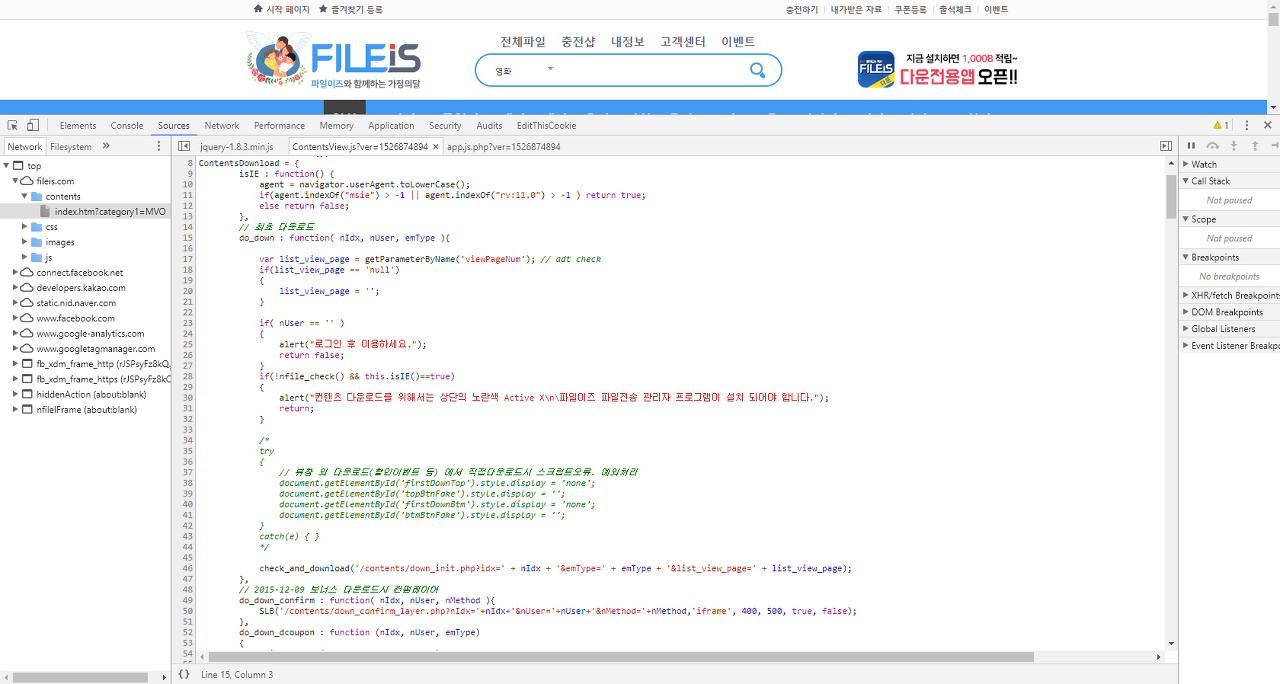 - 서버단의 down_confirm_layer.php에서 파라메터인 파일아이디, 사용자아이디 결제방법을 이용하여 실결제가 이루어지고, 이후 익스플로러인지 기타 브라우저인지 체크하는 로직들이 포함된 do_down()으로 분기